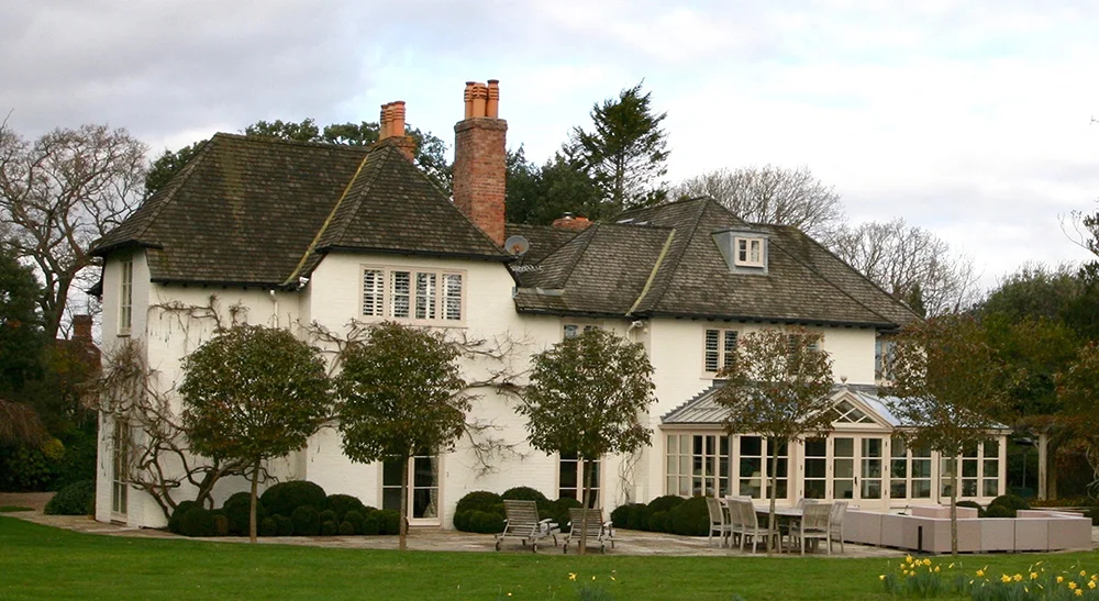 Inspirational garden design pushed back the immediate terrace - out to connect with the pool and the lawns. Radical changes to the curtilege included introducing a series of shallow spherical sweeping grass steps, which ripple outwards from the house to the newly planted 500 trees in the woodland beyond the meadow.